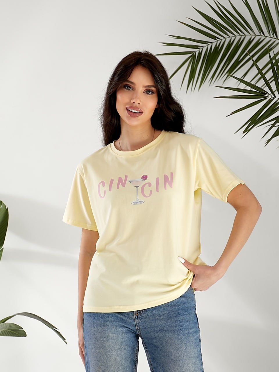 Футболка с коктейльным настроением и розовой надписью “Cin Cin”. Свободный крой, приятная на ощупь ткань, идеальная для повседневного образа.