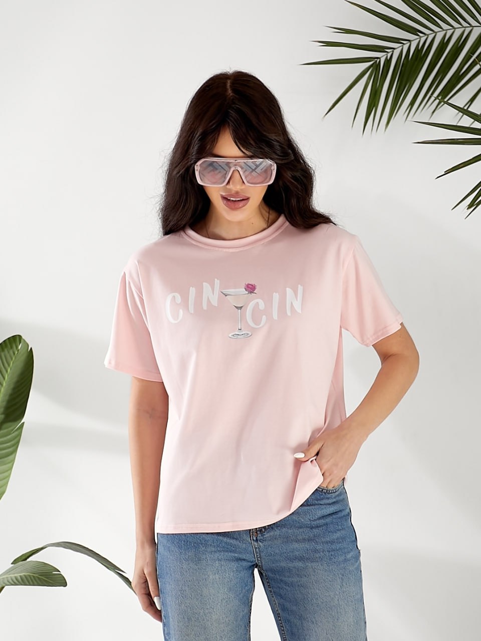 Футболка с коктейльным настроением и розовой надписью “Cin Cin”. Свободный крой, приятная на ощупь ткань, идеальная для повседневного образа.