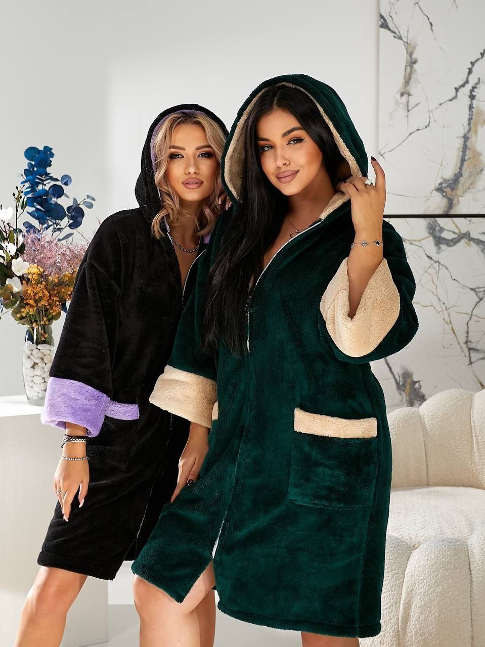 ✨Халат с капюшоном имеет удобный свободный крой,длинные рукава с объемными манжетами и два кармана контрастного цвета.Застегивается на молнию по центру.
