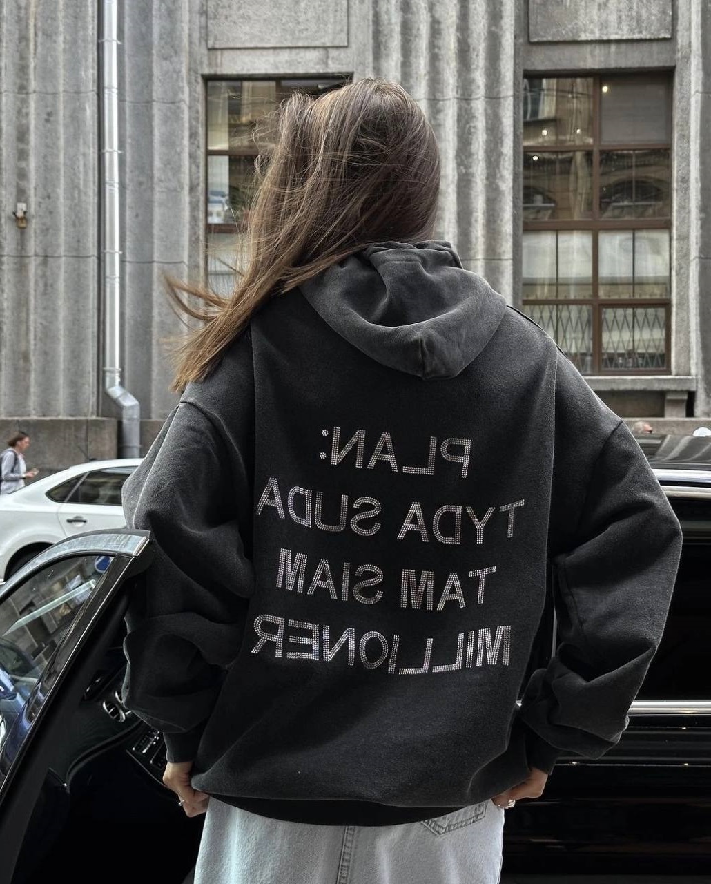 Худи оверсайз капюшон надпись на спине с камнями графит