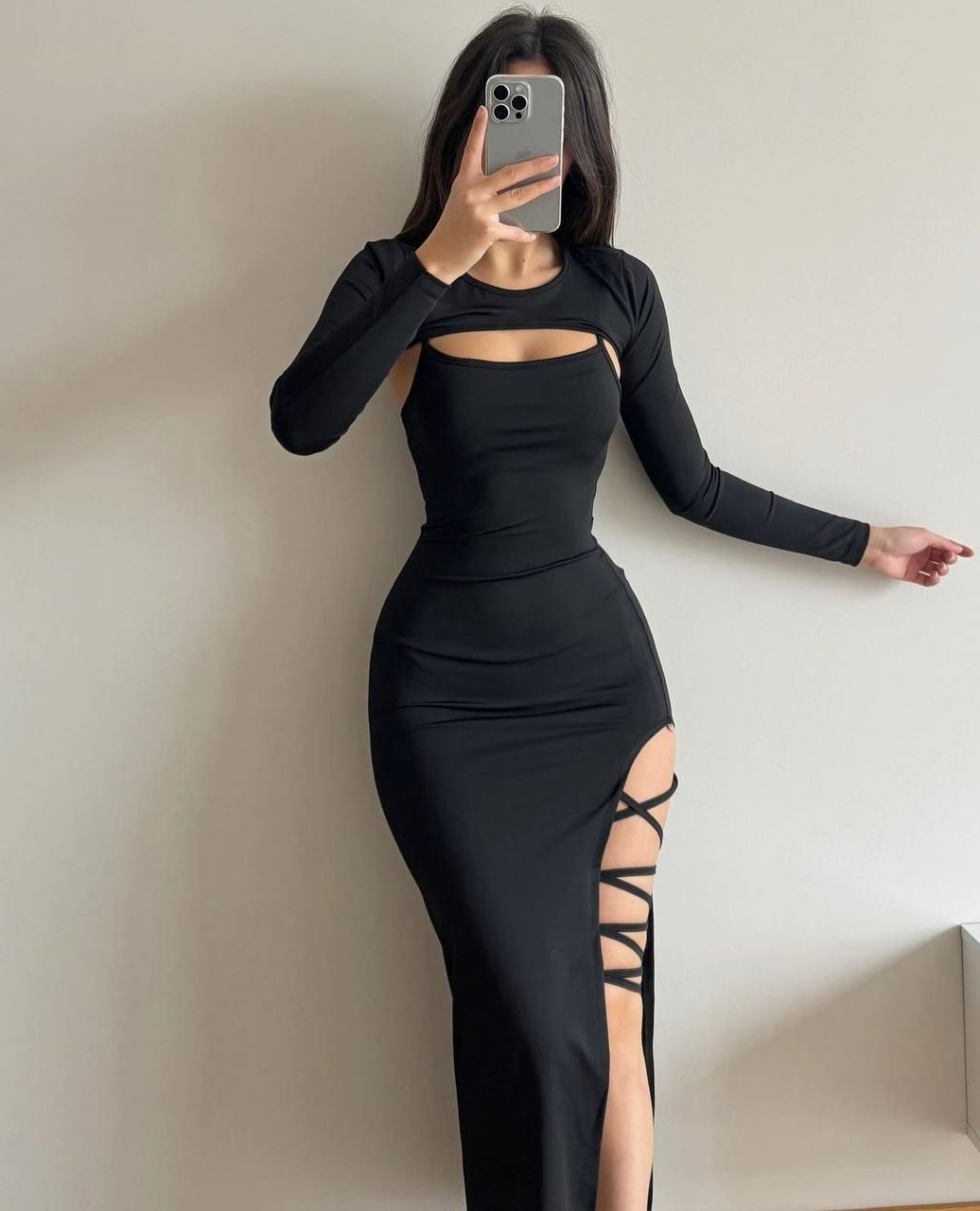 Замечательный комплект из платья и топа, в котором очень удобно. С выразительной деталью – вырез на ноге и завязками. Ткань с приятной текстурой, хорошо тянется и подчеркивает фигуру. Платье на лямках.