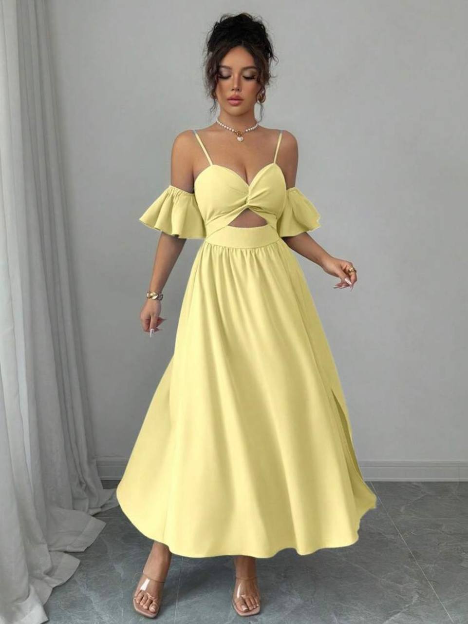 Изящное платье меди с открытыми плечами и тонкими бретелями желтый