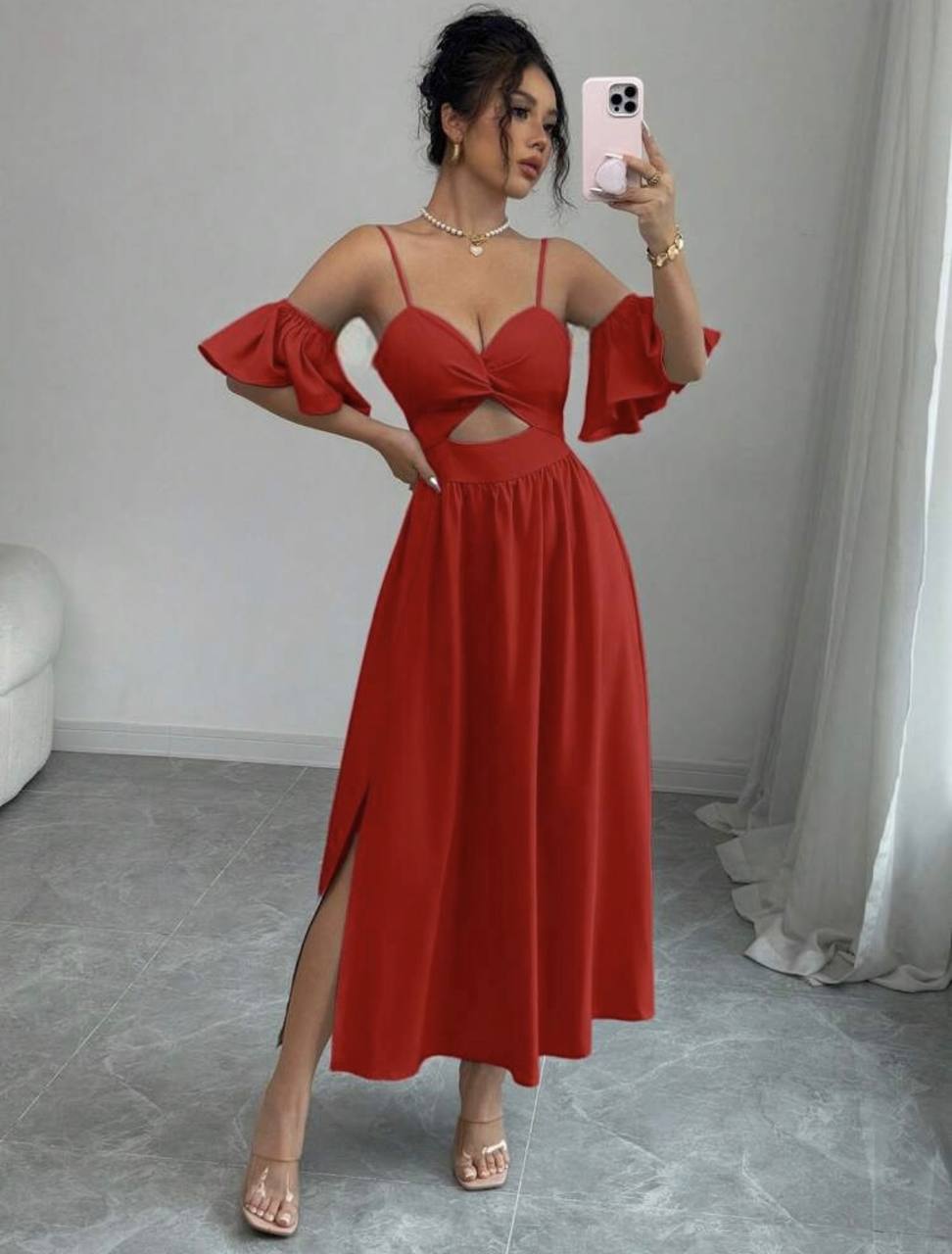Изящное платье меди с открытыми плечами, тонкими бретелями и вырезом под грудью. Легкая юбка и воланы на рукавах придают образу романтичности и женственности.