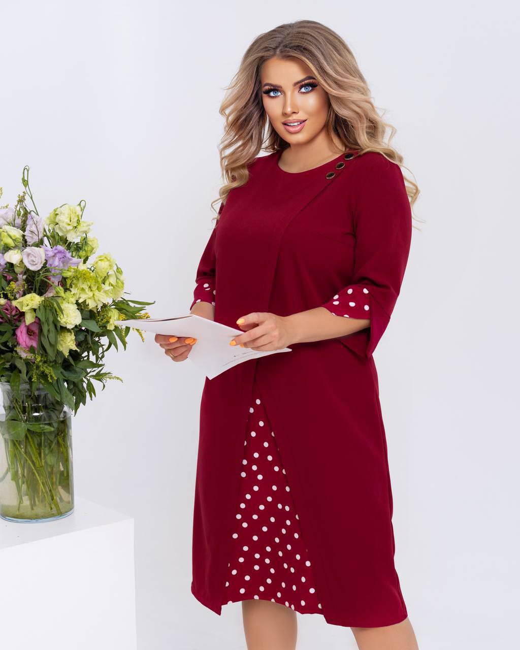 Классическое платье с вставками в горох бордо