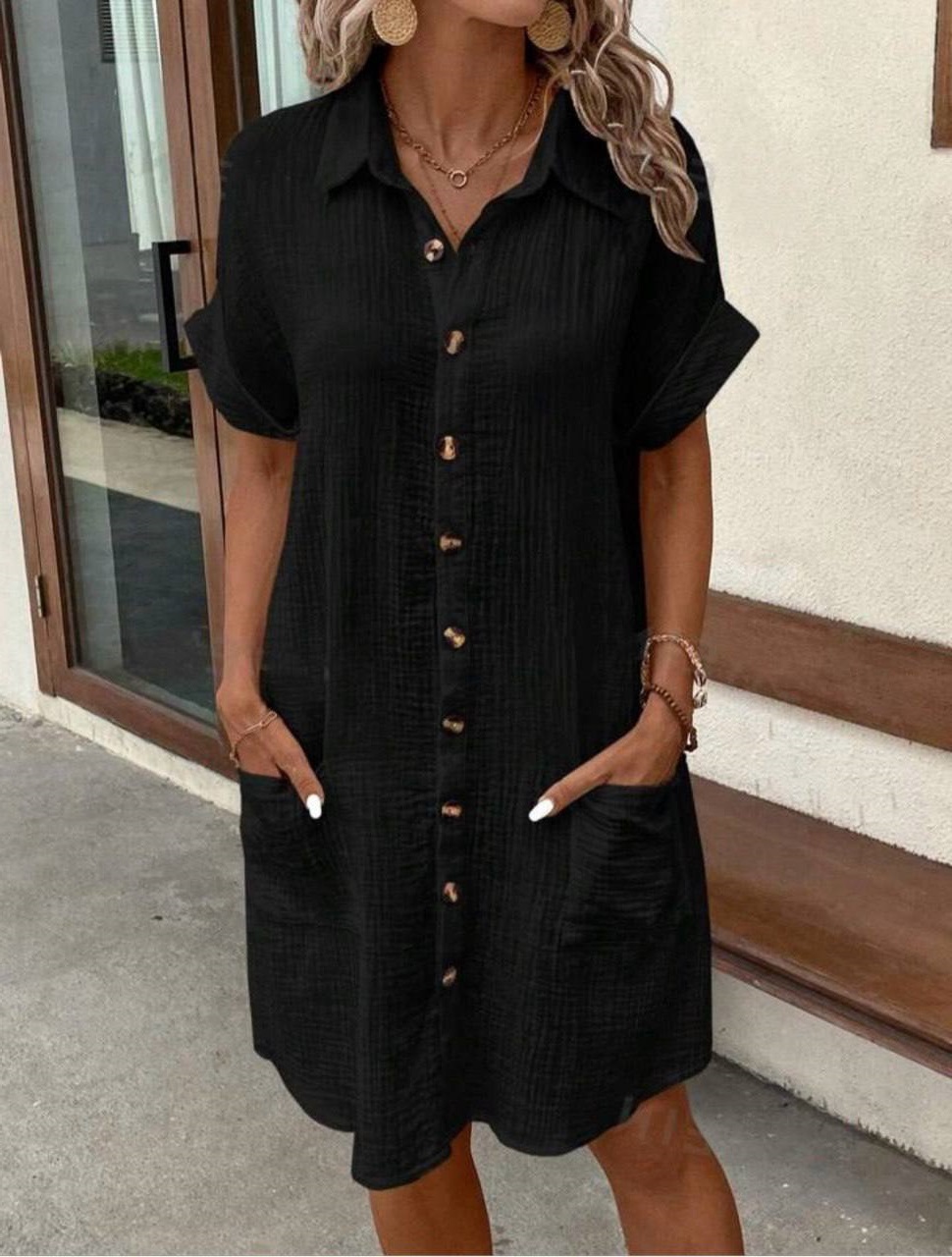 Фасон платья имеет крой рубашки, что придает ему непринужденный вид.