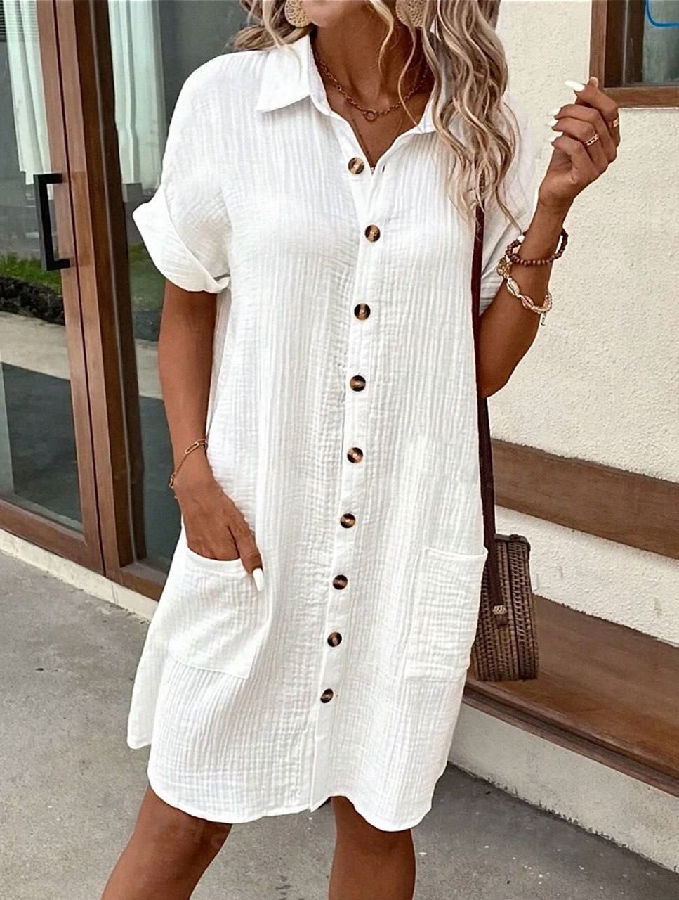 Фасон платья имеет крой рубашки, что придает ему непринужденный вид.