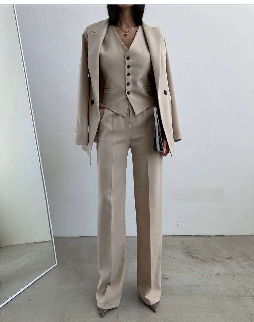 Головна » Магазин » Одяг » Жіночі костюми » Классный классический костюм тройка (жилет+пиджак+брюки) бежевый