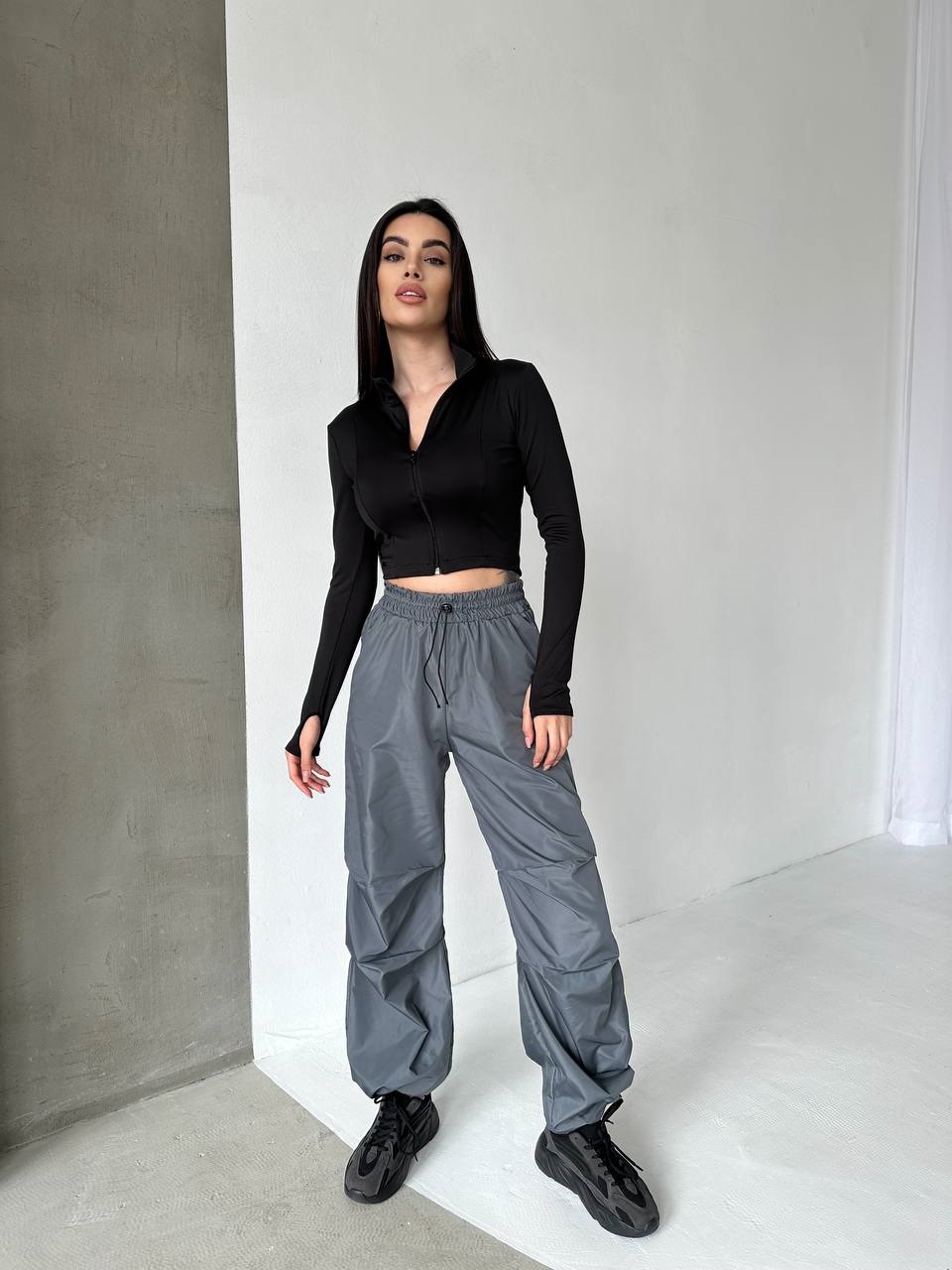 Классный костюм(свободные брюки плащевка внизу на затяжках+укороченная кофта на молнии)черный+графит