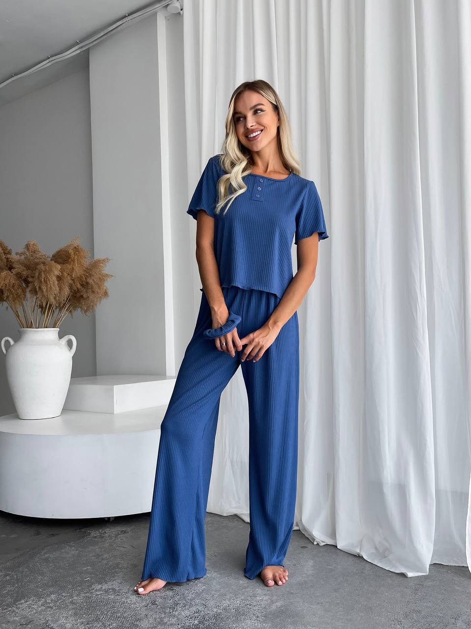 Класссный Костюм-тройка (топ+штаны+резинка) трикотаж рубчик синий