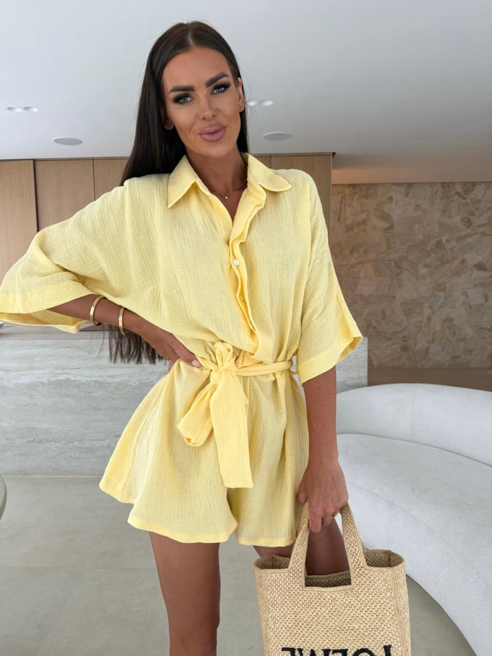 Комбинезон свободного кроя из муслина с поясом (рубашка+шортики) лимон