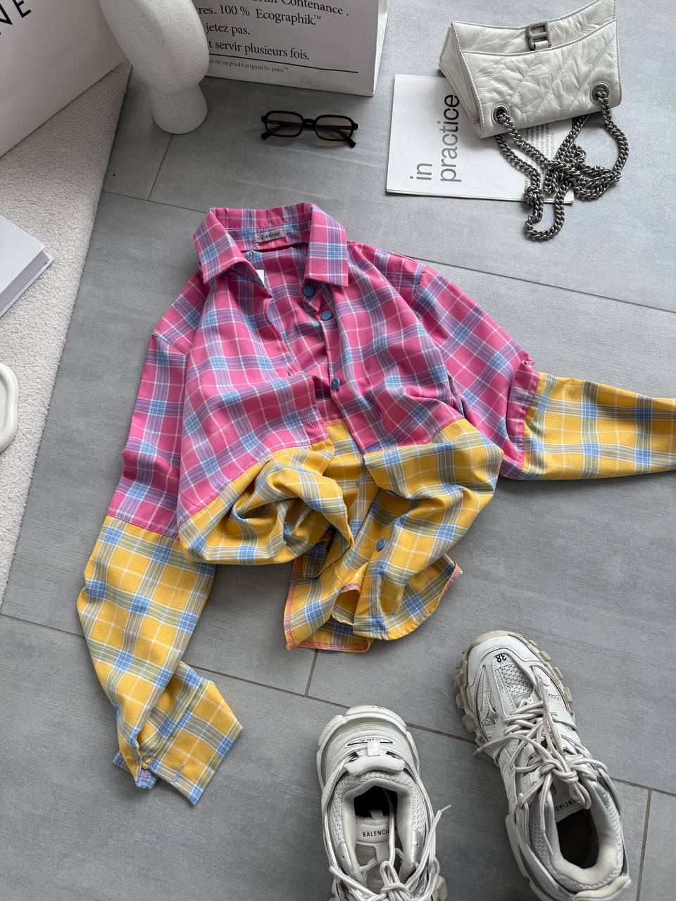 Головна » Магазин » Одяг » Куртки сорочки » Комбинированная рубашка на пуговицах (фланель) розовый с желтым
