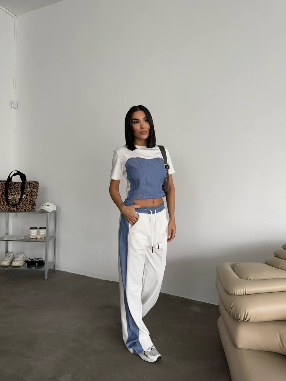 Головна » Магазин » Одяг » Жіночі костюми » Комбинированный костюм: футболка+штаны (двухнить+джинс бенгалин) белый+джинс