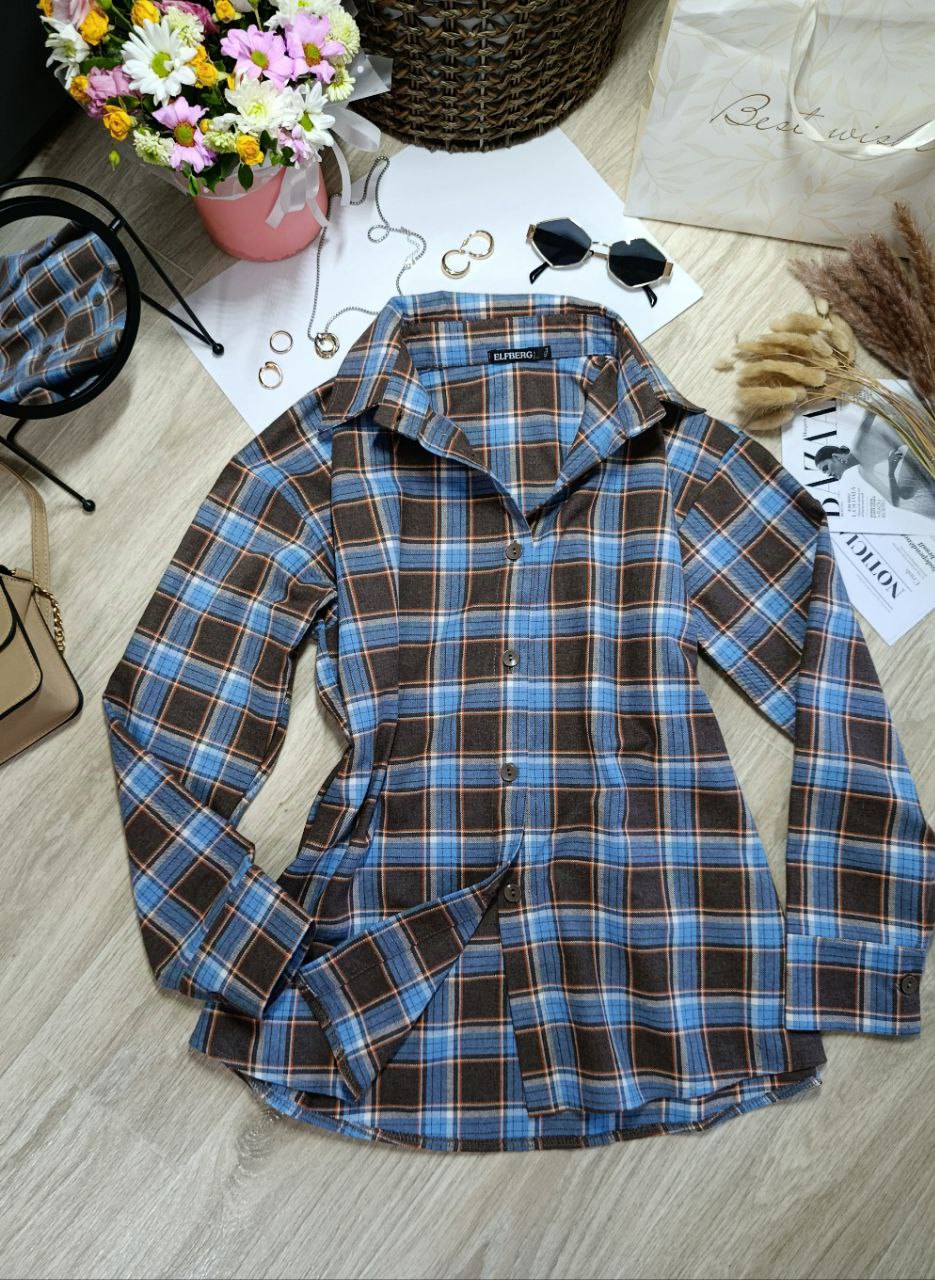 Комфортная базовая женская рубашка в клетку шоколад/голубой