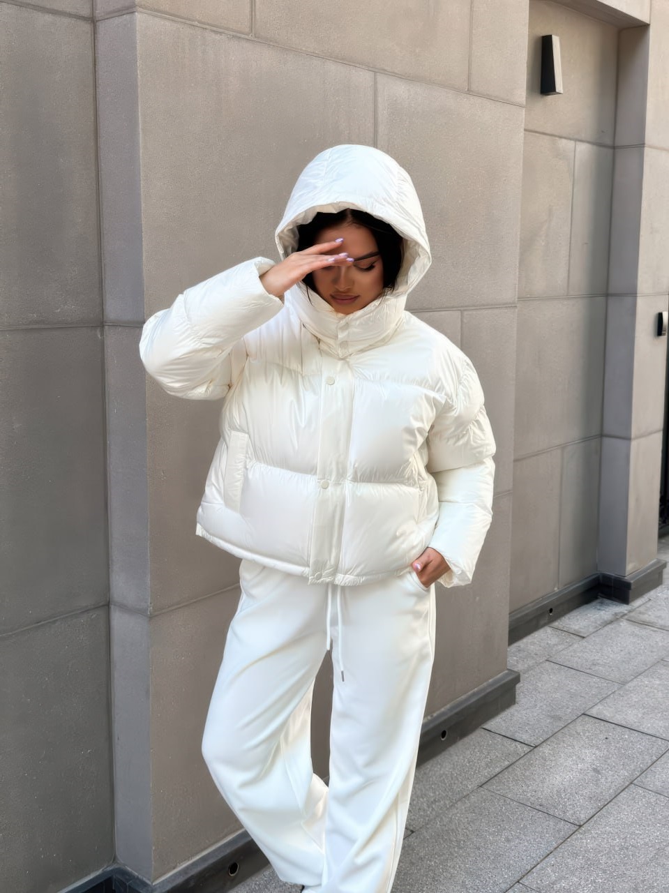 Куртка дутик с карманами и капюшоном на холодное время года.