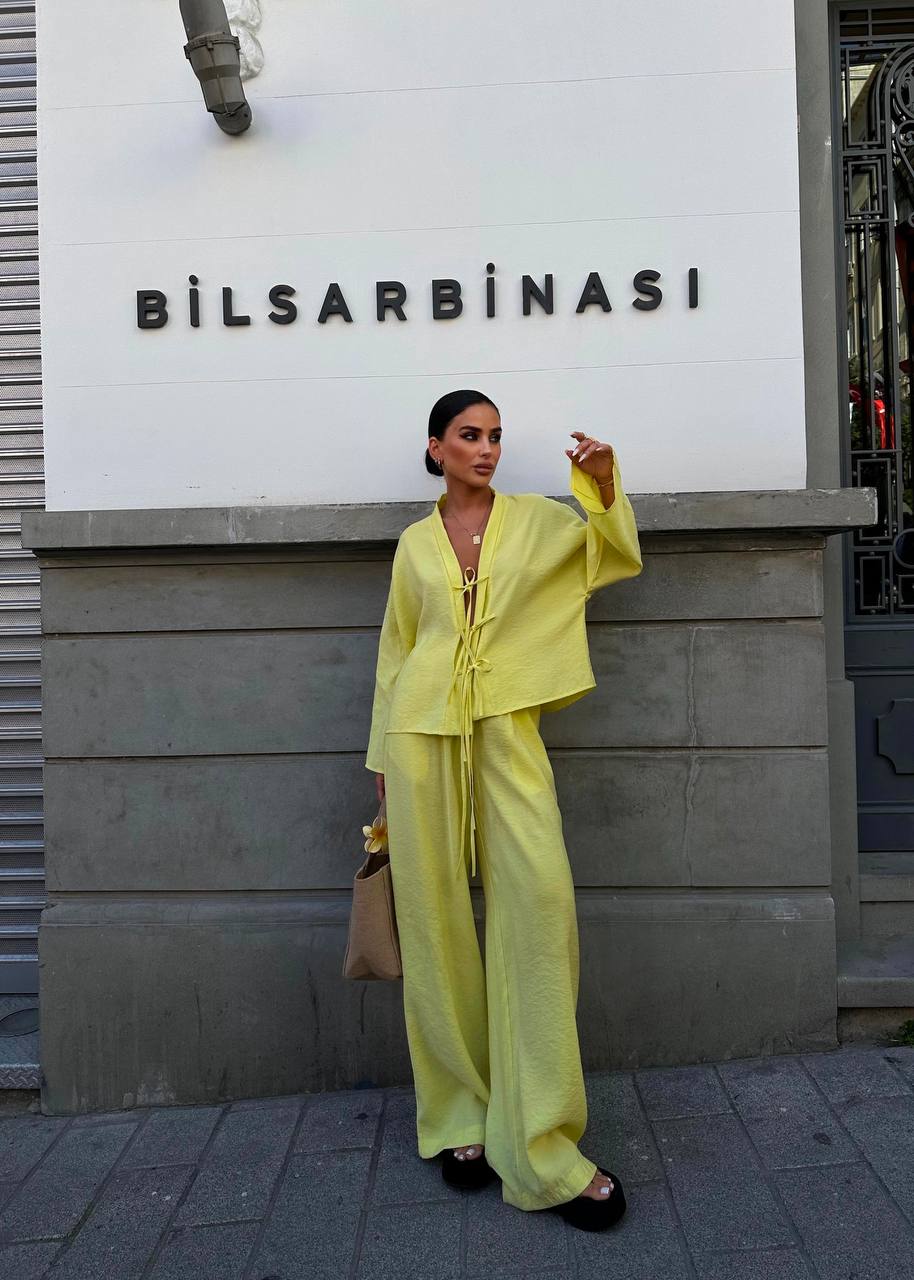 Головна » Магазин » Одяг » Жіночі костюми » Комфортный брючный костюм из жатки свободного кроя (брюки+кофточка на завязочках) желтый