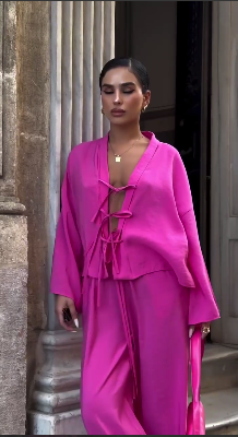 Головна » Магазин » Одяг » Жіночі костюми » Комфортный брючный костюм из жатки свободного кроя (брюки+кофточка на завязочках) малина
