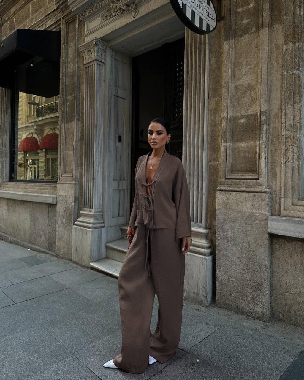 Головна » Магазин » Одяг » Жіночі костюми » Комфортный брючный костюм из жатки свободного кроя (брюки+кофточка на завязочках) мокко