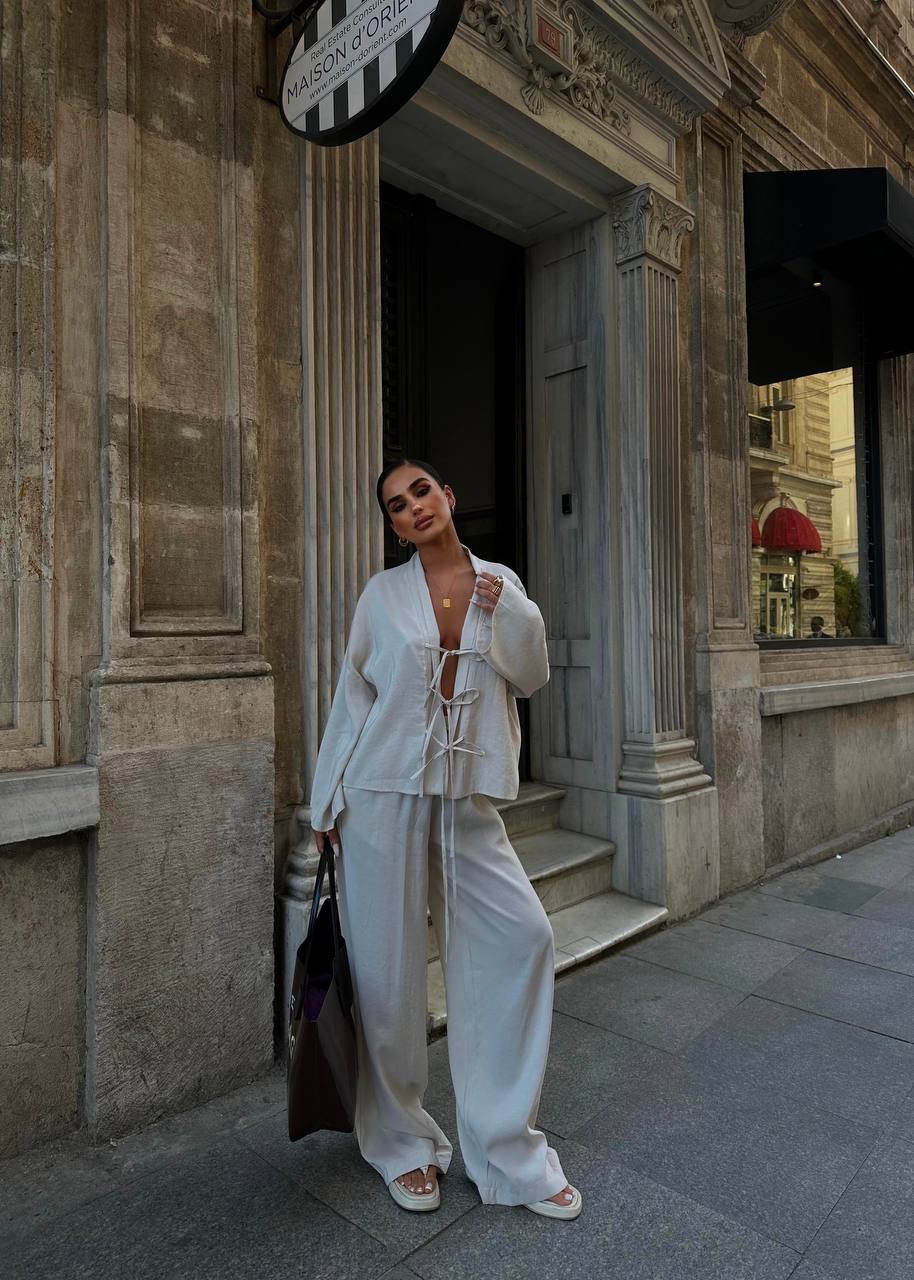 Головна » Магазин » Одяг » Жіночі костюми » Комфортный брючный костюм из жатки свободного кроя (брюки+кофточка на завязочках) бежевый