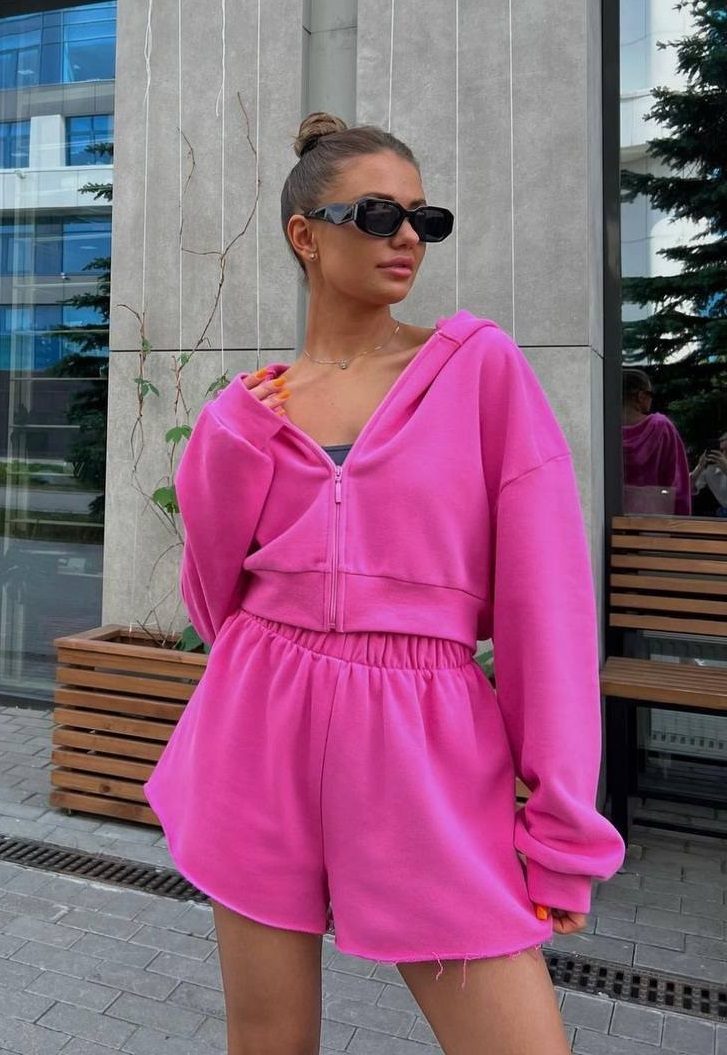Костюм: укороченное зип-худи + шорты, сочетающий удобство и хороший внешний вид. Высокая посадка, свободный крой, актуальный дизайн.