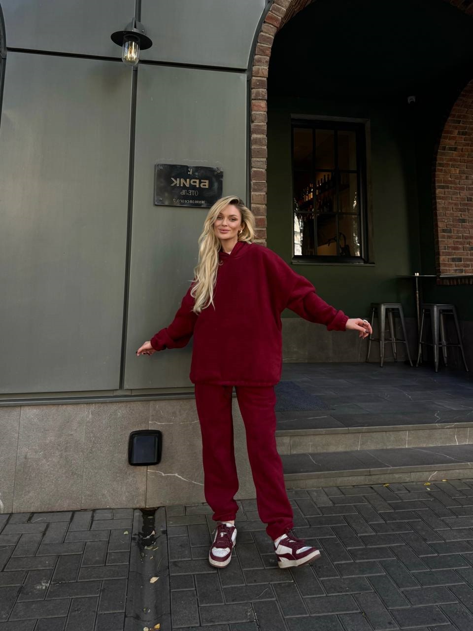 Комфортый костюм из флиса (кофта с капюшоном+брюки с карманами+манжетами по низу) бордо