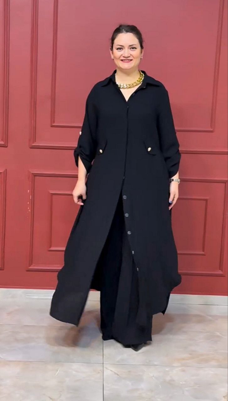 Стильный, универсальный комплект двойка (кардиган+штаны палаццо). Кардиган можно использовать в качестве платья и носить отдельно, декорированный клапанами на пуговицах. Брюки свободного кроя, пояс на резинке.