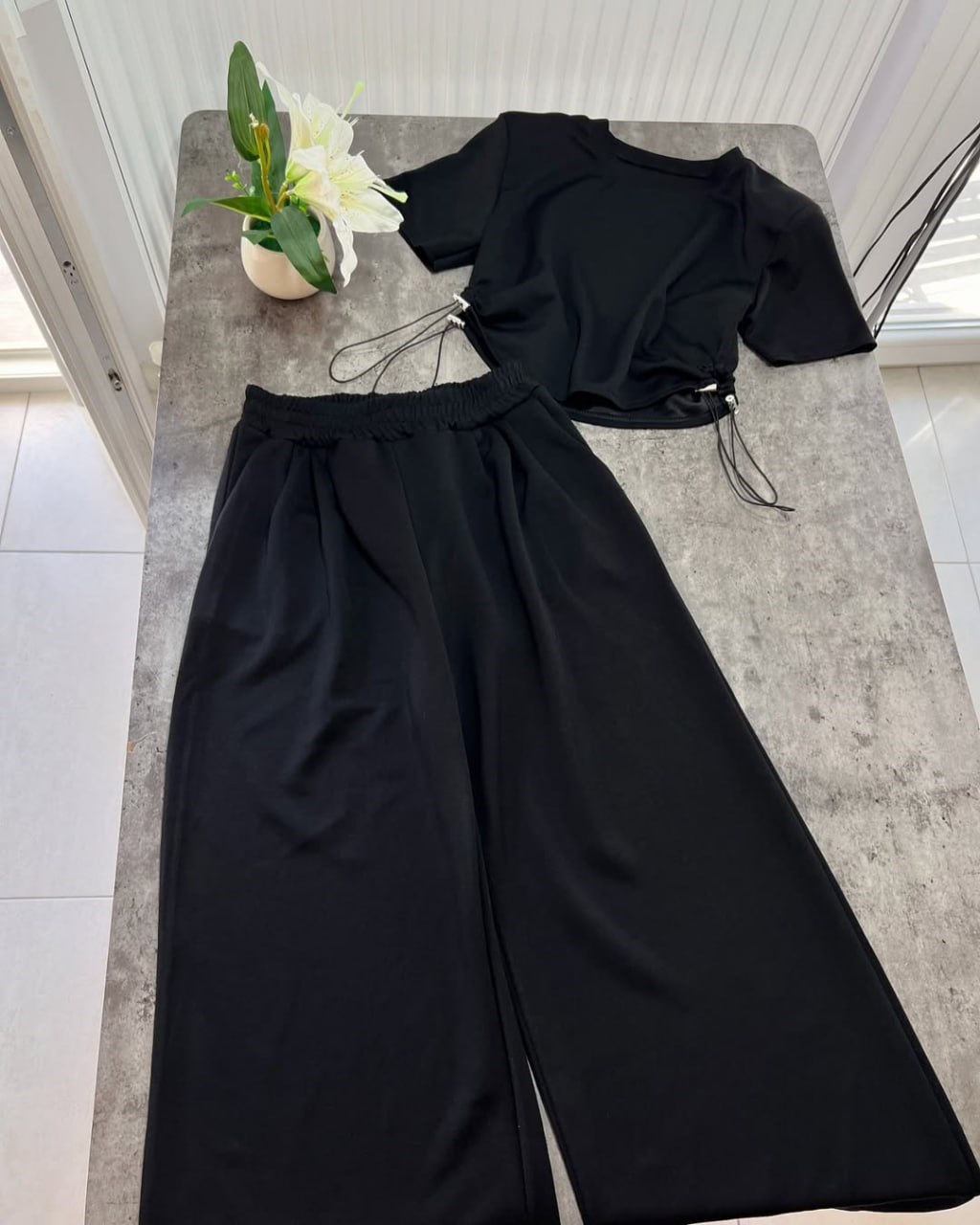 Комплект: футболка с декоративной шнуровкой по бокам + брюки клеш с высокой посадкой.