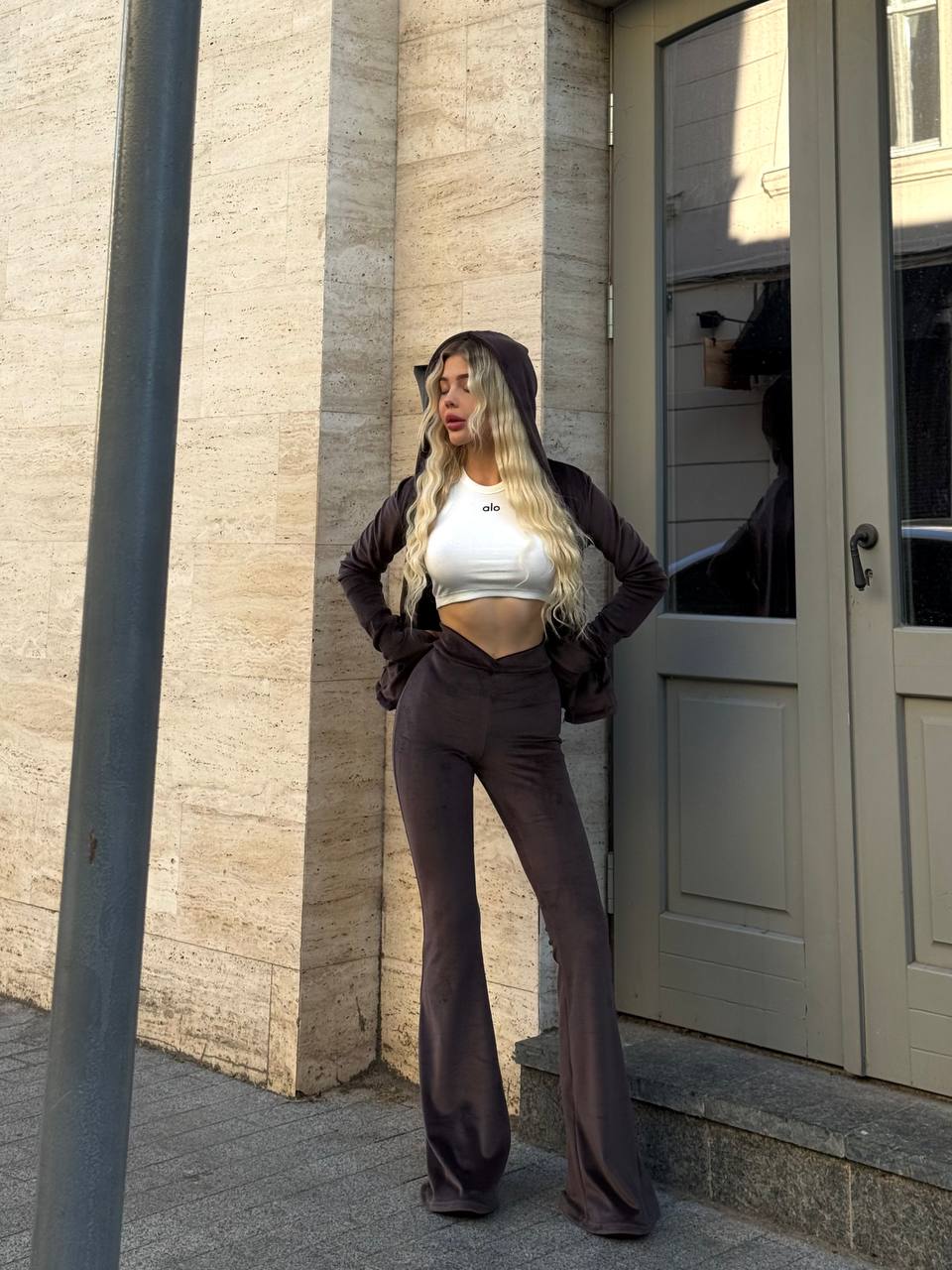 Комфортный костюм из мягкого велюра – идеальный выбор для создания модного образа! Комплект состоит из кофты на молнии с длинными рукавами с вырезом для пальчика и двойным капюшоном и стильных брюк-клеш от колена, которые визуально делают вас стройнее и выше. Материал приятен к телу, эластичен, хорошо тянется и хорошо подчеркивает фигуру.
