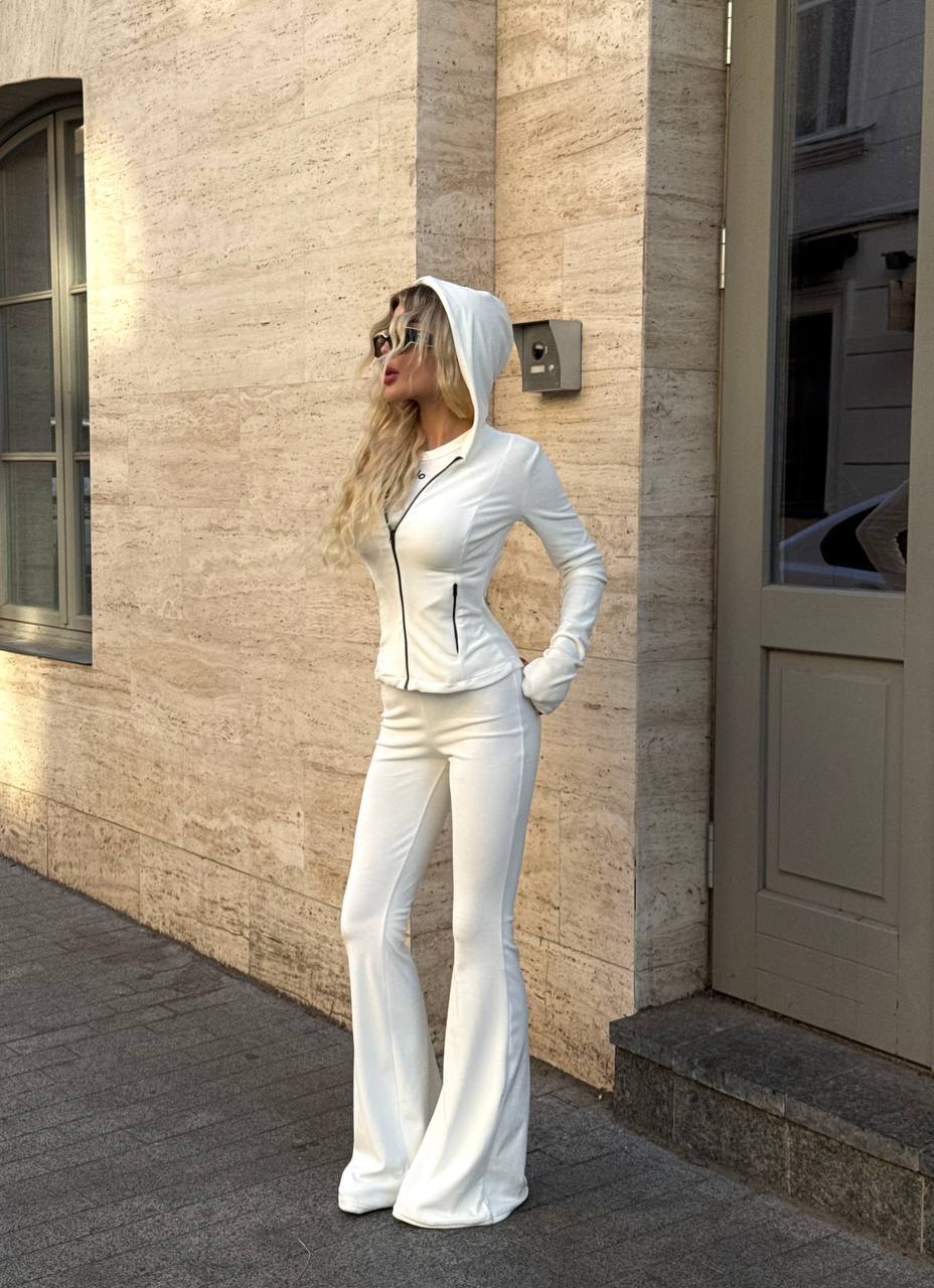 Комфортный костюм из мягкого велюра – идеальный выбор для создания модного образа! Комплект состоит из кофты на молнии с длинными рукавами с вырезом для пальчика и двойным капюшоном и стильных брюк-клеш от колена, которые визуально делают вас стройнее и выше. Материал приятен к телу, эластичен, хорошо тянется и хорошо подчеркивает фигуру.