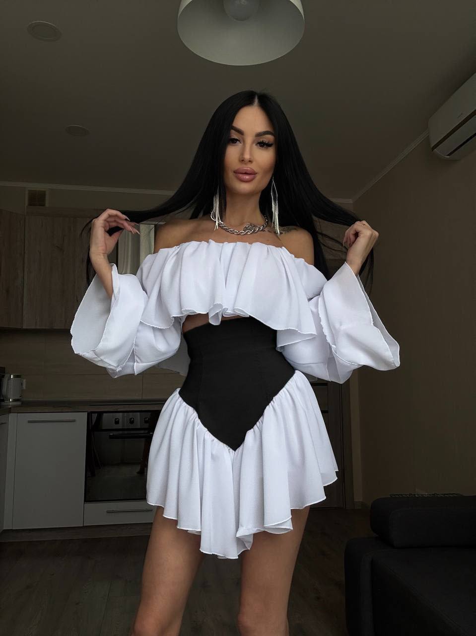 Комплект Многослойная воздушная блуза и шортики-юбочка белый с черной вставкой