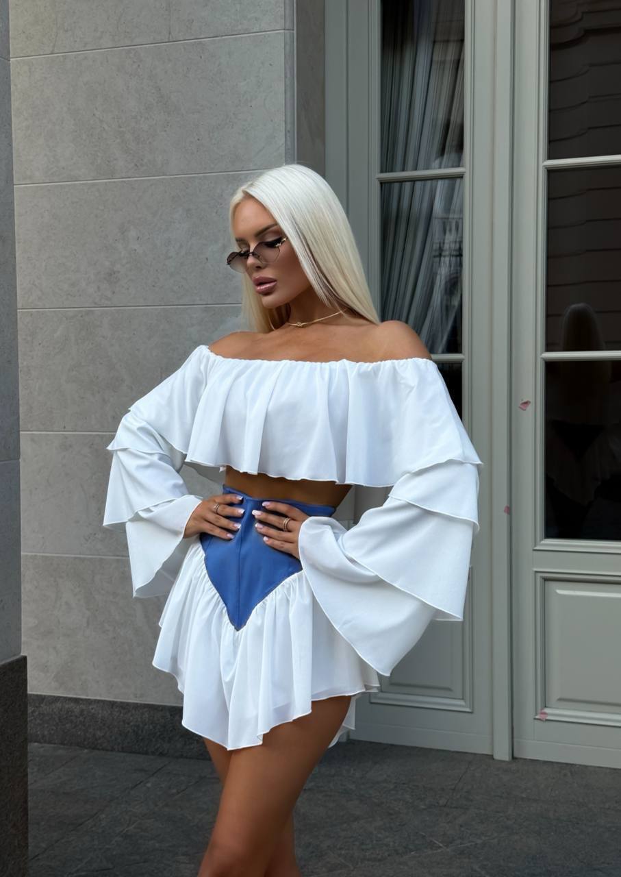 Комплект состоит из многослойной воздушной блузы и шортиков-юбочки. Не просвечивает