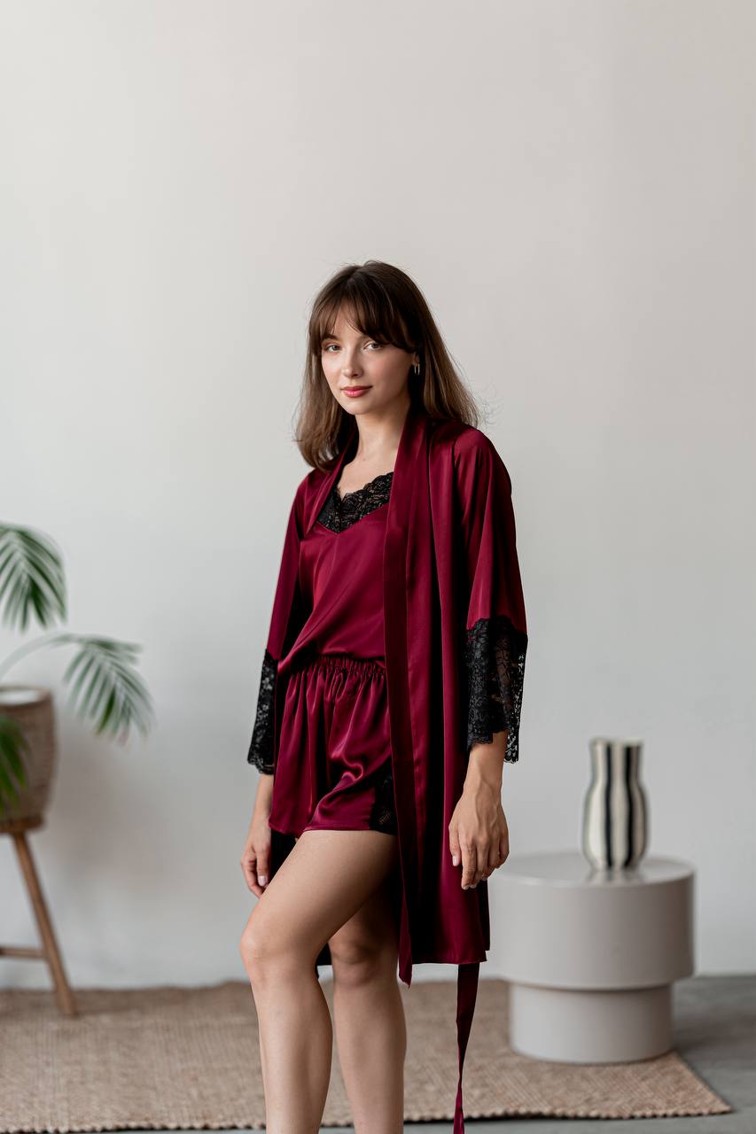 Головна » Магазин » Одяг » Піжама та домашні костюми » Комплект пижама ТРОЙКА: Халат, майка, шорты бордо