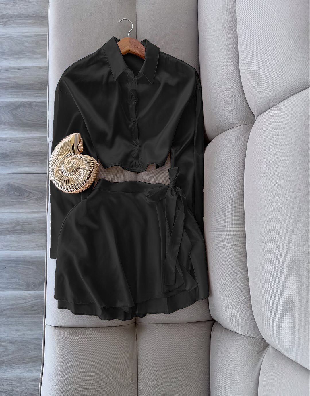 Будьте першим, хто залишив відгук “Комплект: Рубашка свободного кроя+юбочка на запах черный”“