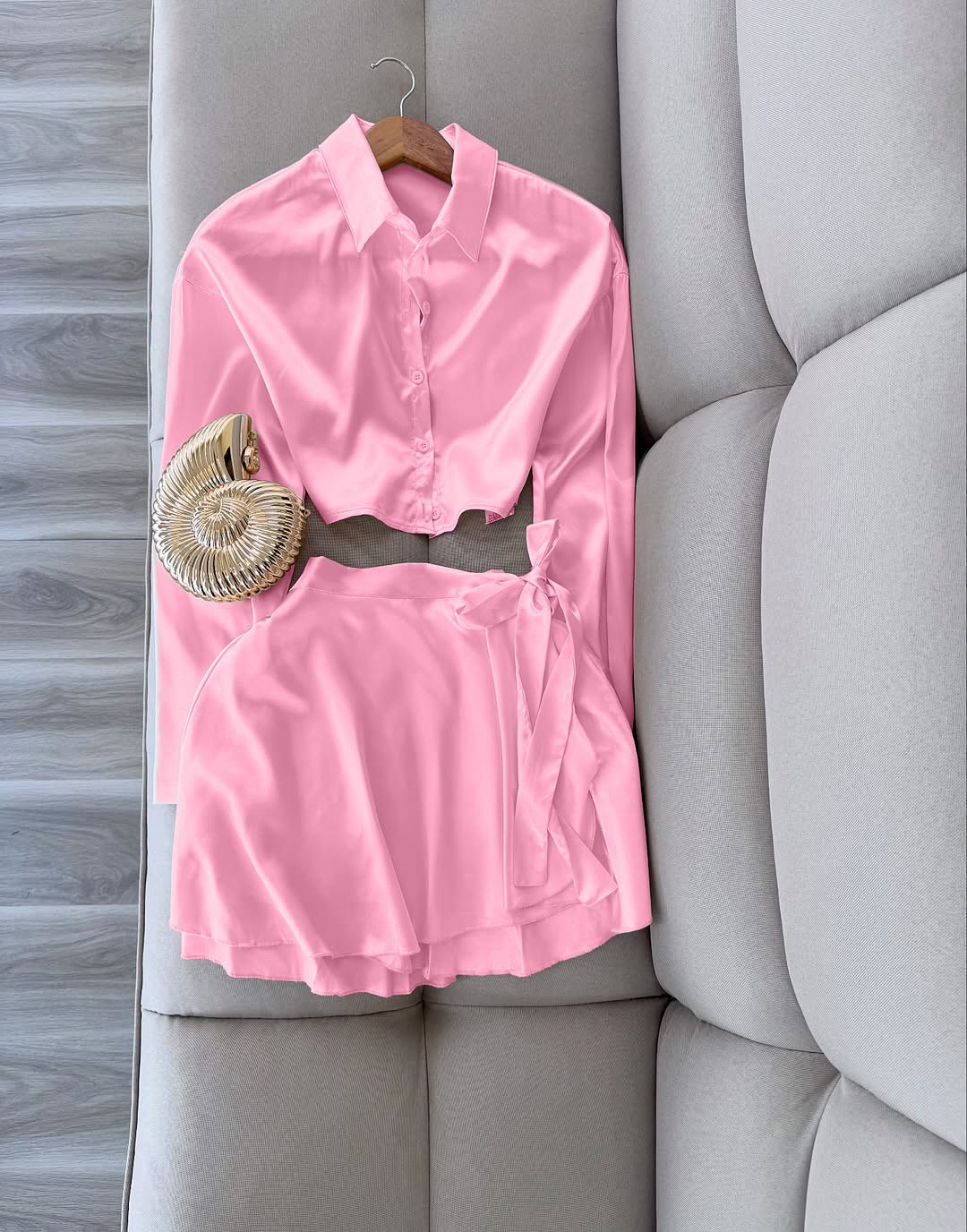 Будьте першим, хто залишив відгук “Комплект: Рубашка свободного кроя+юбочка на запах розовый”“