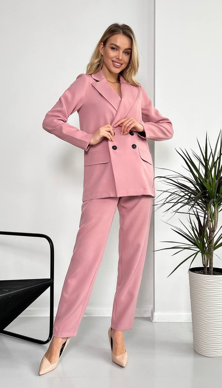 Комплект включает пиджак свободного кроя с плечиками, штаны высокой посадки на завязках и топом.