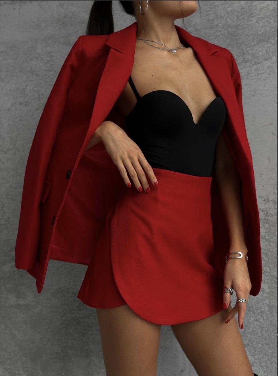 Будьте першим, хто залишив відгук “Костюм 2-ка Пиджак без подкладки + Юбка-шорты красный”“