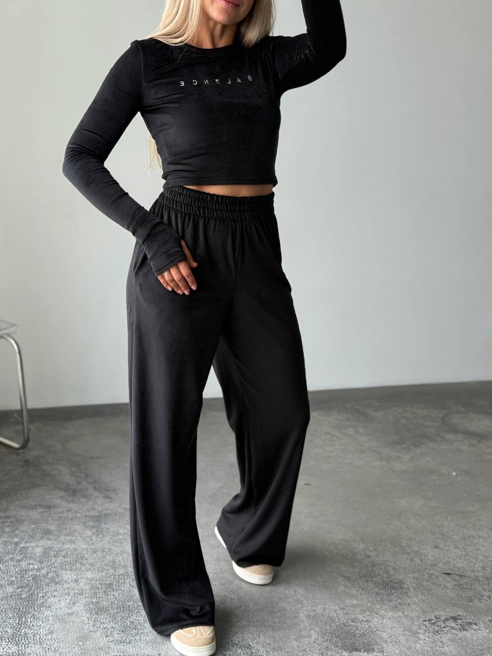 Костюм 2-ка велюр: кофта с вышивкой+прямые штаны черный