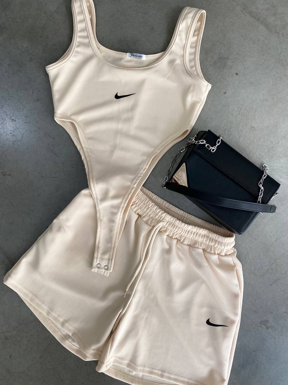 Хит! Замечательный костюм из качественной ткани в рубчик. Боди с высокими разрезами, застегивающиеся на кнопки; шорты свободного кроя высокой посадки, рабочие карманы.