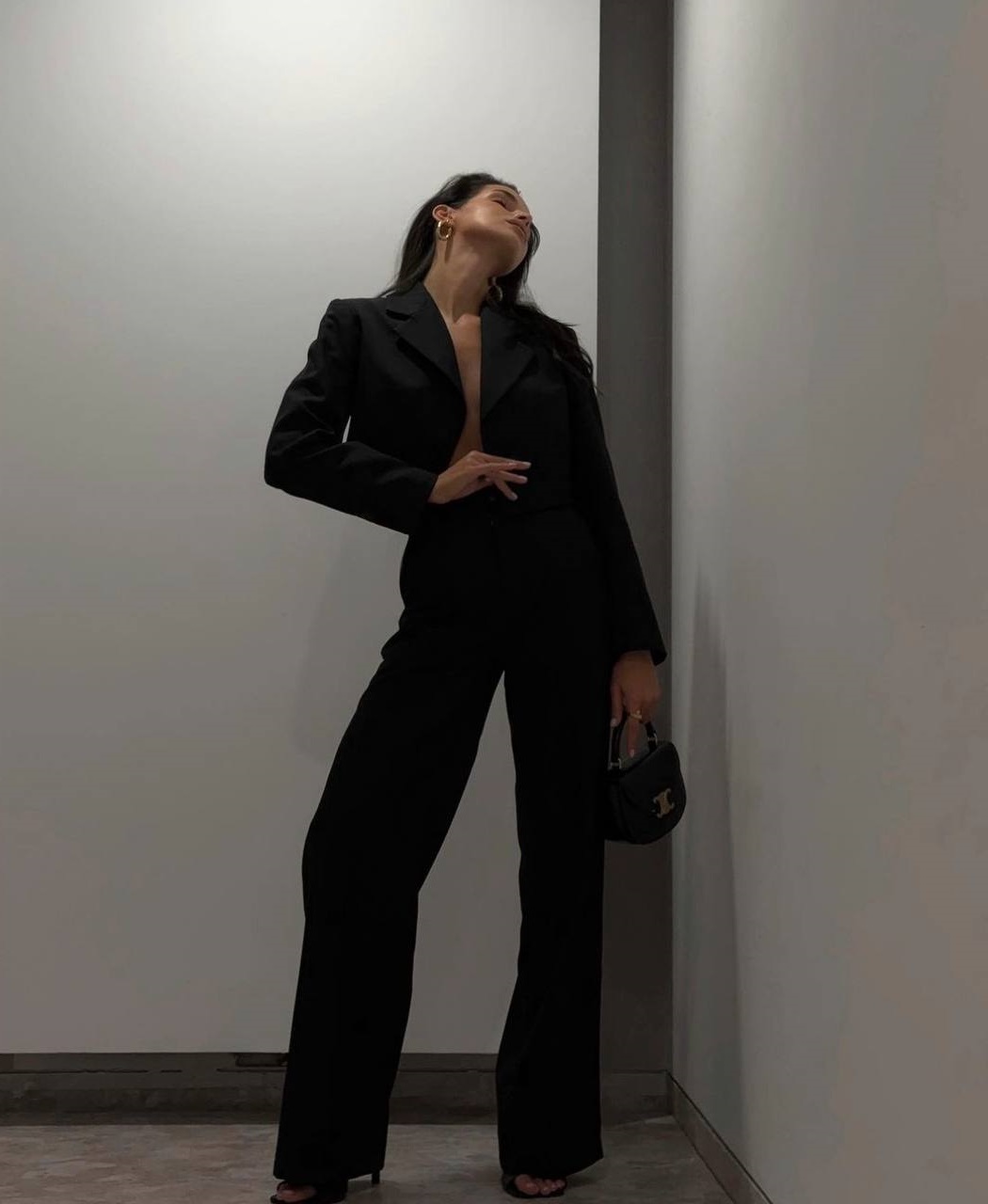 Брюки на высокой посадке, клеш от бедра; пиджак с плечиками, застегивается на гудзик;