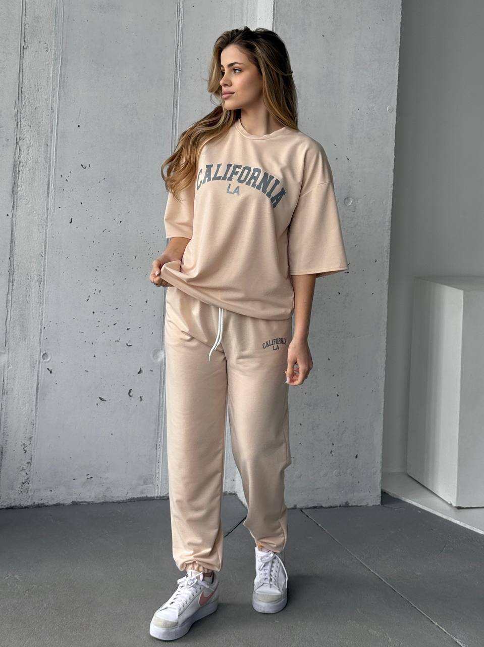 Футболка со спущенным плечом, штаны с карманами, пояс на просроченной резинке + шнурок, по низу манжеты на резинке.