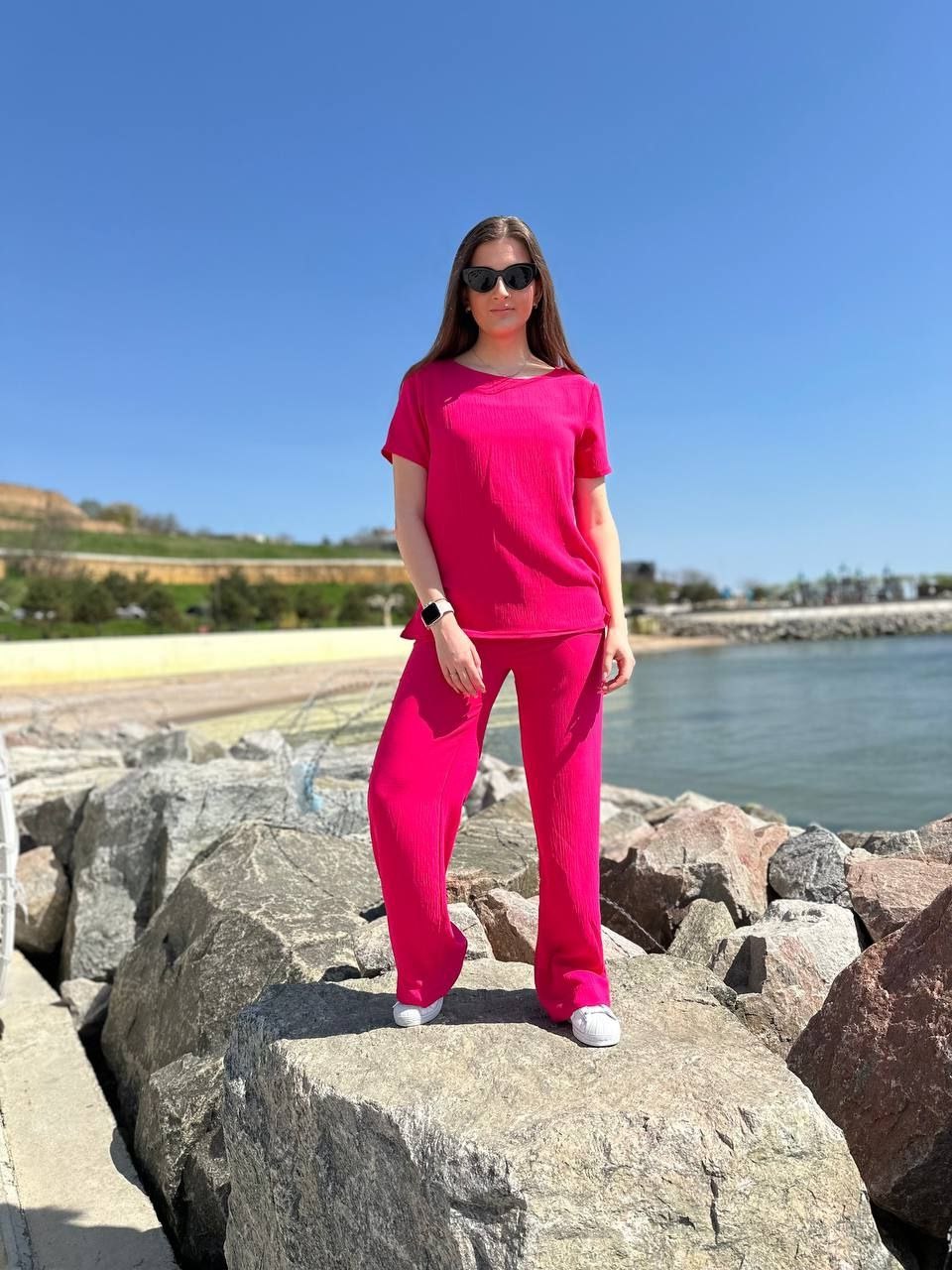 Будьте першим, хто залишив відгук “Костюм двойка футболка с пояском + штаны малина”“