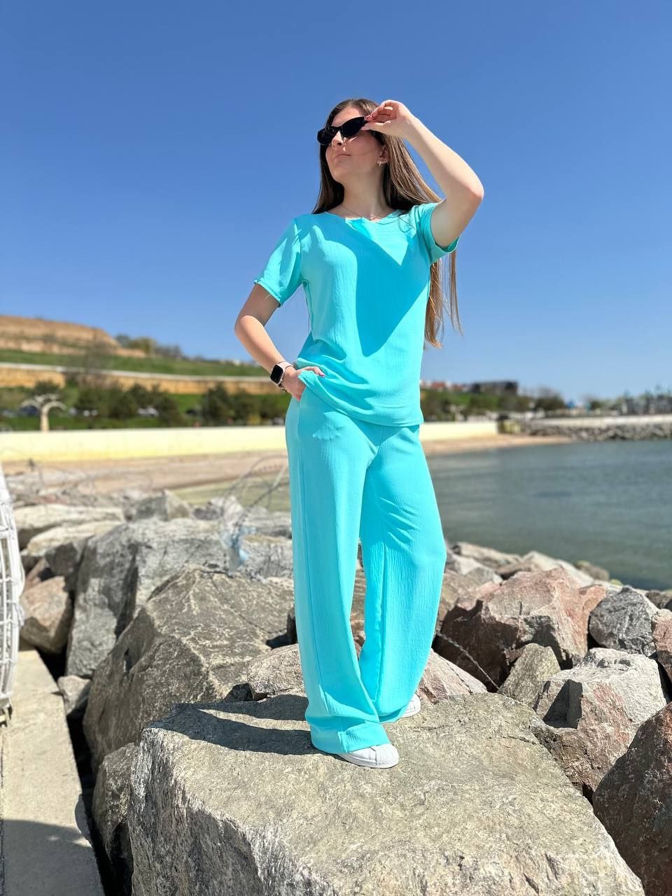 Будьте першим, хто залишив відгук “Костюм двойка футболка с пояском + штаны мята”“