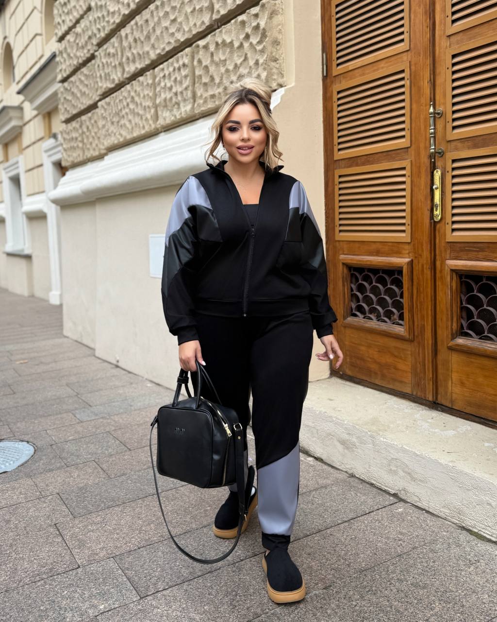Костюм-двойка интересного кроя со вставками экокожи: кофта на молнии (в цвет основания), по бокам кармана, на рукавах и по низу манжеты. Брюки на широкой резинке, по бокам кармана, по низу манжет