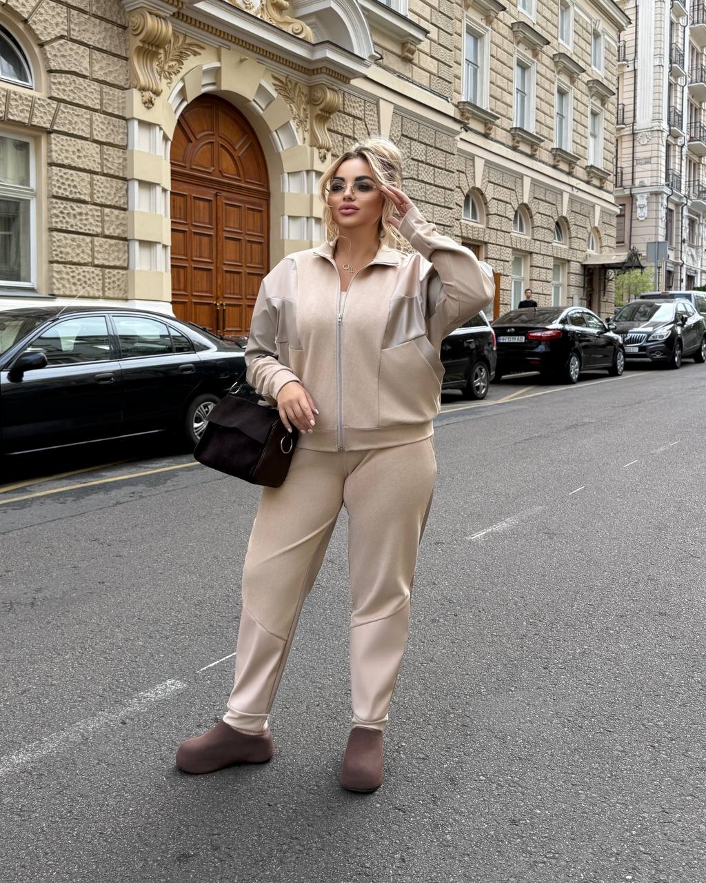 Костюм-двойка интересного кроя со вставками экокожи: кофта на молнии (в цвет основания), по бокам кармана, на рукавах и по низу манжеты. Брюки на широкой резинке, по бокам кармана, по низу манжет