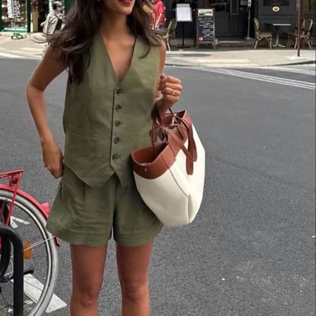 В комплекте жилет с V-образной горловиной и фигурным низом, спереди застегивается на пять пуговиц, карманы-обманки. Шорты с карманами, пояс сзади на резинке для идеальной посадки, без шлевок.