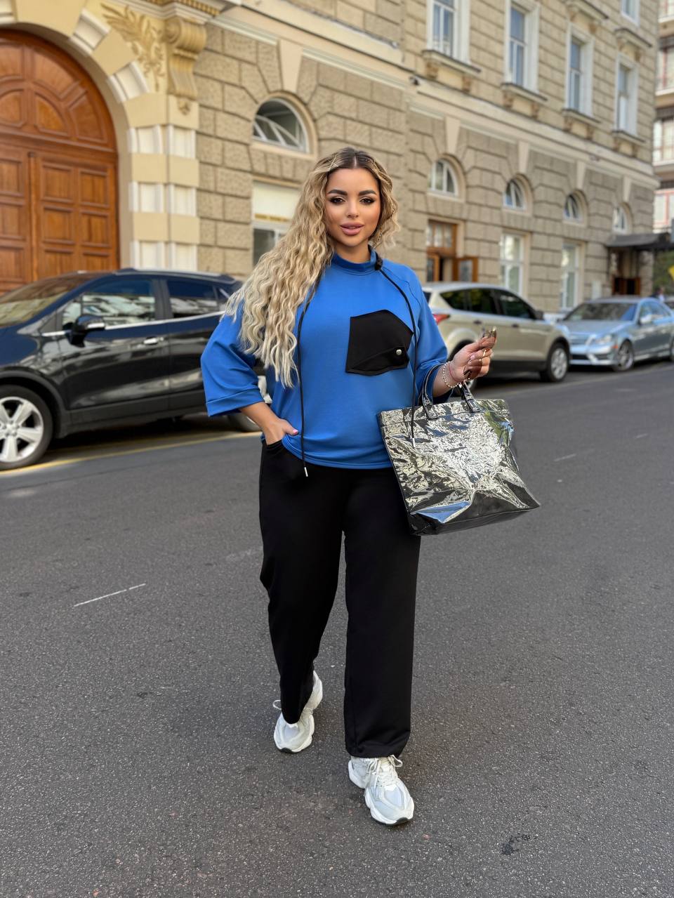 ▫️Костюм-двойка выполнен из двунити. Свободная кофта, хороший канатик на горловине, и декоративный карман на кнопке. Брюки на резинке