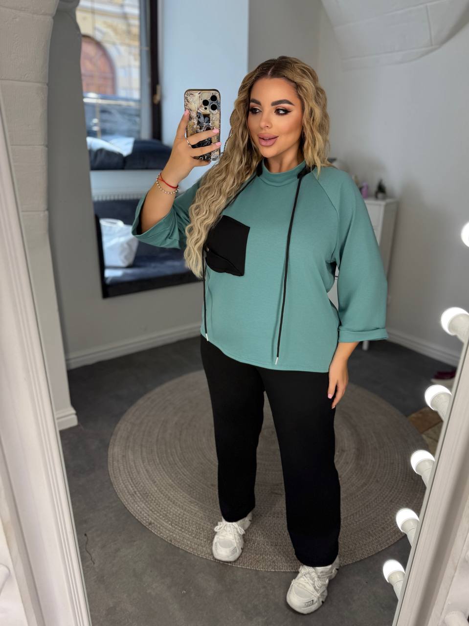 ▫️Костюм-двойка выполнен из двунити. Свободная кофта, хороший канатик на горловине, и декоративный карман на кнопке. Брюки на резинке