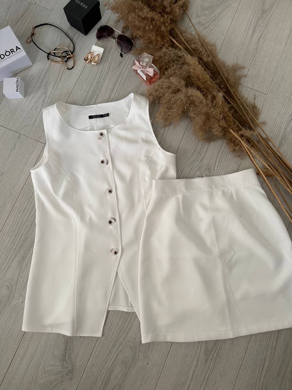 Костюм двойка Удлиненный жилет и мини юбка молочный