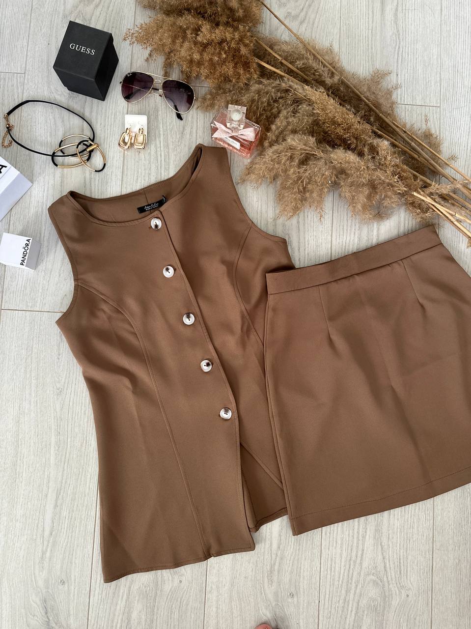 Удлиненный жилет и мини юбка застегивающаяся на молнию