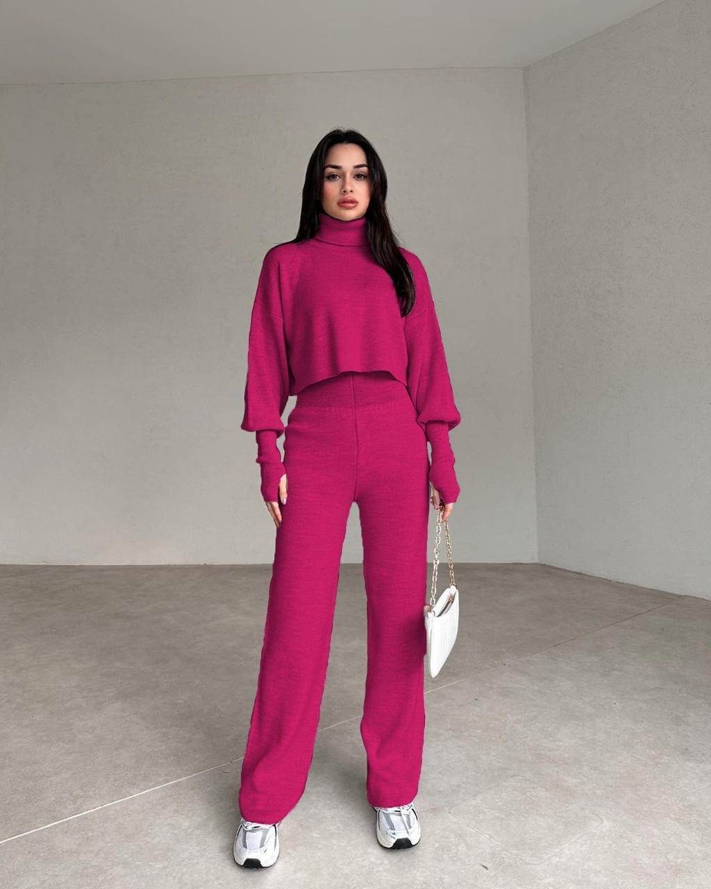Костюм-двойка: укороченный свитер и клешенные штанишки малина