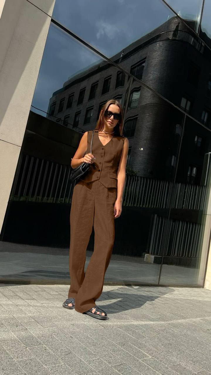 Костюм двойка Жилет на пуговицах+брюки палаццо (хлопок жатка) мокко